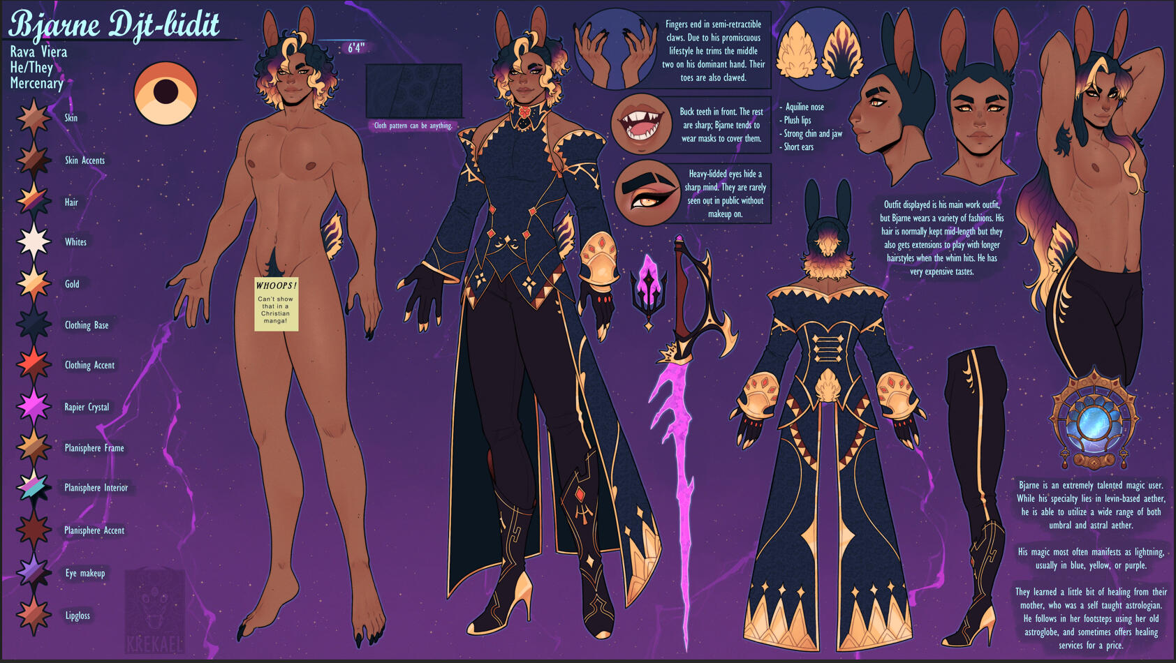 Bjarne's mother left her tribe before he was born to be with his father, a Hrothgar apothecary, in a small settlement. While there she became interested in the healing capabilities of an astrologian after hearing about it from a merchant friend, who happened to have a small collection of related books that had managed to make their way out of Sharlayan and into his hands. From there she tried her best to piecemeal an education for herself in it, eventually managing to get her hands on a small, old astroglobe. Little Bjarne learned what he could along with her, curious about what his mother was doing. Between her and his father he gained a solid understanding of physical healing and a moderate understanding of aether and aetherical healing.This little family and their relatively peaceful life were interrupted by a Garlean contingent razing the settlement to the ground upon suspicion of harbored spies. Bjarne lost his mother and presumably his father, the latter's body having never been found. All the viera had left was a few of his mother's books and that old astroglobe.Bjarne was eventually "adopted" by a mercenary, who more or less raised him as his own in the mercenary trade. Bjarne learned the skills of a red mage from this parental figure, and eventually struck out on his own once old enough.Motivated by money and an itch to wander, Bjarne hides himself in layers of charm and the veneer of a self-centered casa nova, refusing to form close bonds with others as a form of protection for himself. Unfortunately he is no stranger to heartbreak, having his own trust betrayed many times over over the course of his mercenary work. Despite this, there is still a small kernel that refuses to remain buried; he still offers healing services (for a fee, of course), and despite himself hes found himself enjoying the continued company of some individuals.